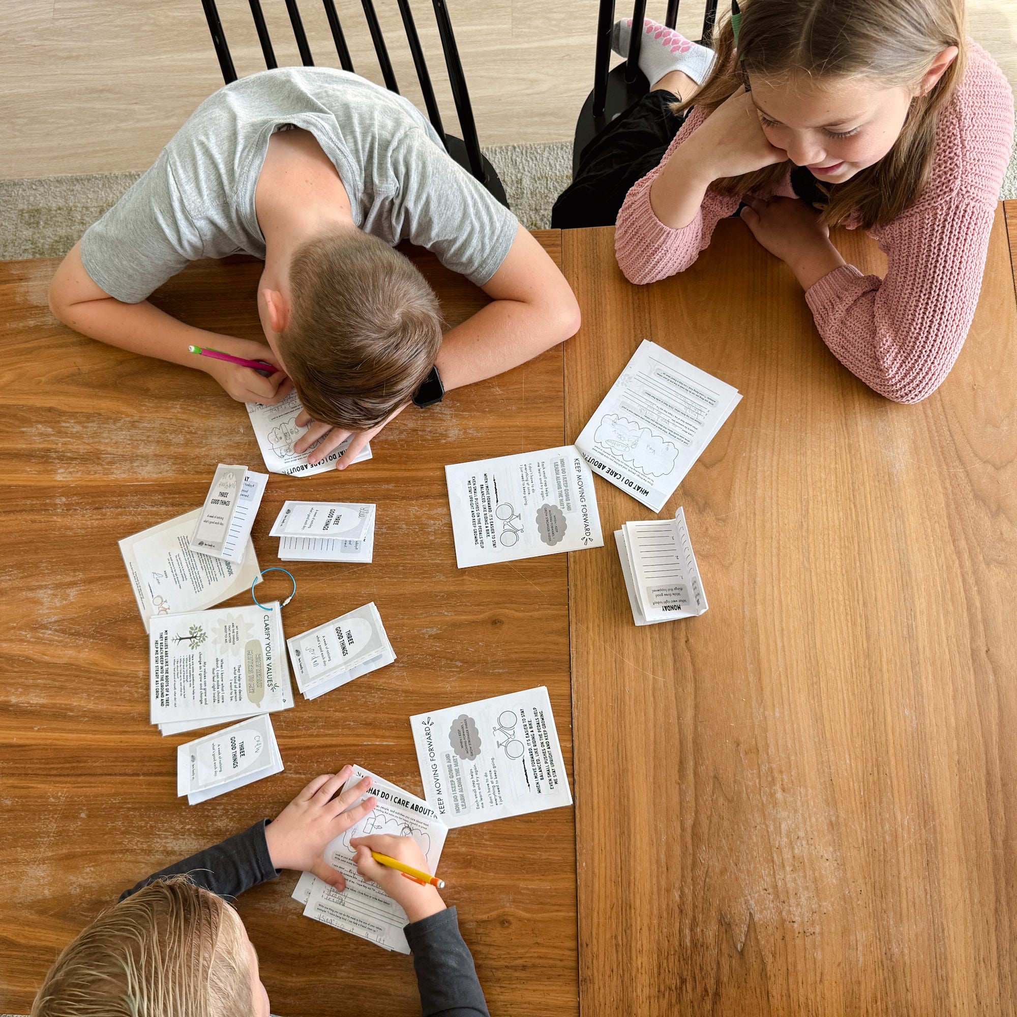 Each topic includes a visual poster and a guided worksheet, designed to build self-awareness, kindness, gratitude, and confidence through everyday reflection and conversation.